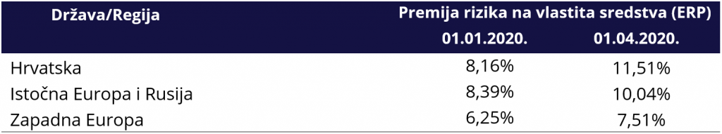 U nastavku je prikazana premija rizika na vlastita sredstva (eng. ERP – Equity Risk Premium) Hrvatske usporedno s ponderiranim prosjekom Europe na 01. siječnja 2020. i 01. travnja 2020. godine. (Izvor: Damodaran)